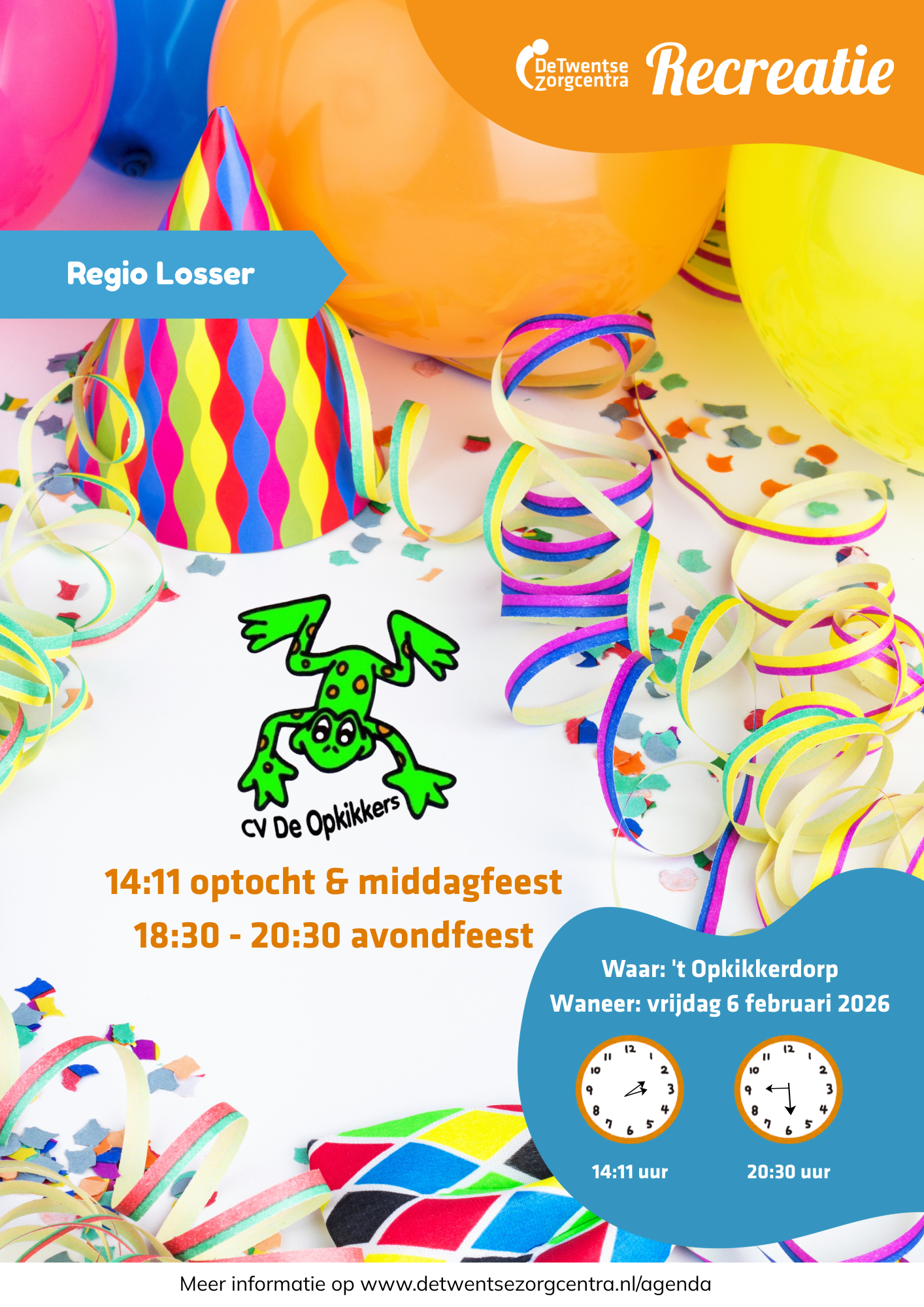 Doe je niet mee in de optocht, zorg dan dat jullie tuin/straat versierd is en kom naar de optocht kijken. De route wordt nader bekend gemaakt, maar is op het terrein van de LosserHof.